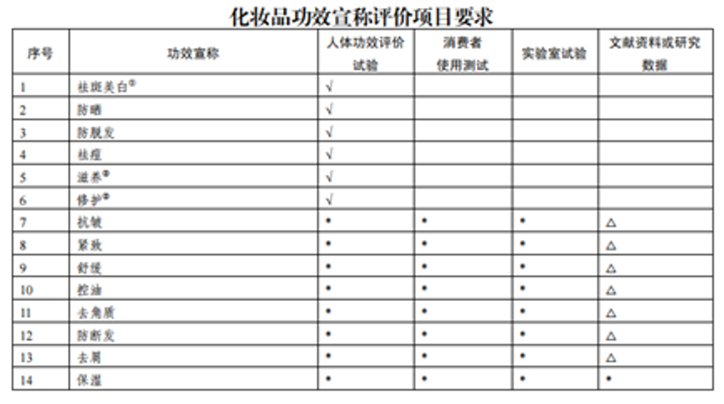 国家对化妆品功效宣称有严格规定。根据《化妆品功效宣称评价规范》,不同功效的化妆品需要提供相应的科学证据。请看下方表格,祛斑美白、防晒、防脱发、祛痘 、滋养、修护等产品,必须通过人体功效评价试验来证明效果。而像抗皱、紧致等功效,则可以选择人体功效评价试验、消费者测试或实验室数据中的一种方式来验证。